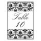 Custom Wedding Reception Table Numbers with an elegant black and white damask pattern as a top and bottom border, and a script font text on both sides. Note, each number for the table card number must be changed and added to your buying cart. The pattern has pretty leaf floral design and scroll detail. Sophisticated or retro vintage chic as a bridal wedding design.