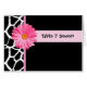 A trendy table number card for a wedding reception with a stylish black and white giraffe pattern embellished with a chic pink daisy flower Personalize by adding the table number.
