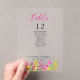 Add a pop of color to your reception with this elegant acrylic table number sign featuring a bold pink script header and delicate floral accents. The clean layout highlights table numbers and guest names for easy navigation while keeping a stylish, modern feel. Perfect for romantic or garden-inspired weddings, this design blends sophistication with a fresh, vibrant touch.