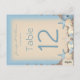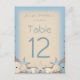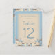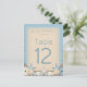 A beautiful destination wedding table number with an exotic beach theme. A pretty sand texture background pattern in neutral cream tones and shades of ocean blue is scattered with lots of little beach pebbles. On top of the pebbles are a variety of sea shells, sea urchins, starfish and pearls.
