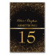 Trendy, but classic gold and black table number cards for your sophisticated gold wedding. Charcoal matte black background with faux gold glitter on the top and bottom borders. A gold metal look divider is centred between the custom bride and groom names in elegant script along with new surname in gold colour and a bold gold hue table number. Identical on other side. Complements Great Gatsby decor and Art Deco themed weddings, too. Add each table number separately to your Zazzle shopping cart using the template.