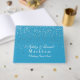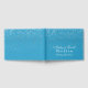 This guest book is shown in Turquoise Blue with a curtain of silver coloured petite stars on both front and back are splattered all over this guest book. Front has text reading your two personalised names in a fancy script, your last name in bold text style.