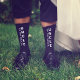 Dress the men of your wedding party with coordinating personalised black socks. "Uncle Of The Groom" is written down the front of the socks in bold white typography. Personalise with your first names and wedding date in simple white typography.