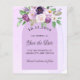 A modern and elegant Save the Date for a wedding. Watercolored violet, lavender background, and an arch frame. Decorated with violet and purple flowers. Personalise and add a date and names. The text: Save the Date is written with a large trendy hand lettered style script.