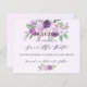 A modern and elegant Save the Date for a wedding. Watercolored violet, lavender background, black text. Decorated with violet and purple flowers. Personalise and add a date and names. The text: Save the Date is written with a large trendy hand lettered style script.