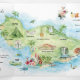 This elegant tri-fold wedding invitation features a hand-painted watercolor illustration of Maui, designed as a keepsake guide for a destination wedding weekend. Soft coastal blues, cool green landscapes, and watercolor details create a refined, storybook aesthetic that feels timeless and elevated.