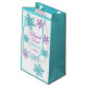 Purple, turquoise (teal) and white winter snowflake personalised wedding welcome bag or wedding shower or bridal shower gift bag. Great for a winter wonderland themed wedding or bridal shower. Or a wedding with a purple, teal and white snowflake theme. Personalised with the bride and groom's name and wedding date. You can also use it as a gift bags for bridesmaid's gifts.