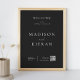 This elegant wedding welcome poster sign features a minimalist design with clean lines and a modern aesthetic. The text is centred and framed with a thin black border, providing a polished and sophisticated look. The poster warmly greets guests to the wedding ceremony and highlights the couple's names in bold, stylish fonts, creating a striking focal point. At the bottom, the sign includes the wedding date and location in a small, refined font. Additionally, there is a QR code on the bottom right, inviting guests to scan and view the wedding program digitally, adding a contemporary touch to the classic design. The overall layout is sleek, simple, and effective, perfect for a modern wedding.