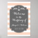 Customisable welcome to our wedding sign poster with wide vintage stripes pattern and classic nautical ships anchor and floral details in coral peach pink, grey and white.