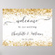 Welcome to an elegant wedding. Personalise and add the names of the bride and groom and a date. Welcome is written with heart swashes. White background, faux gold confetti and black text.