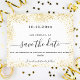 A modern and elegant Save the Date for a wedding. A white background decorated with faux gold glitter. sparkles. Personalise and add a date and names. The text: Save the Date is written with a large trendy hand lettered style script.