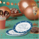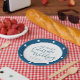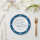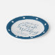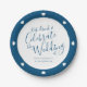 Simple graphic blue script text and white hearts wedding paper plates. Typographical text reads Eat, drink & celebrate the wedding of then add your own names underneath. A great personalised addition to your wedding buffet or party tables. Other matching items and colours available in this design. © Original design by Sarah Trett www.sarahtrett.com for www.mylittleedenweddings.com