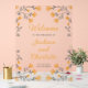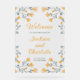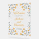 Custom wedding transparent welcome acrylic sign with watercolor wildflowers in grey and orange/yellow colours. Personalise it with the names of the couple getting married, the wedding date, and the location. Ideal reception decor for a spring or summer wedding.