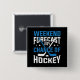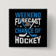 Hockey player button with a humourous saying features white and blue text on a black background that reads Weekend Forecast 100% Chance of Hockey!