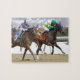 Winter racing at historic Aqueduct Racetrack, home of the prestigious Wood Memorial stakes. Jockey Rajiv Maragh and Junior Alvarez battle head to head for the lead. Colourful closeup of two thoroughbreds being urged for the win.