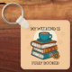 Whimsical keychain design for book lovers and bookworms. An illustration of a cosy pile of books with a coffee cup balanced on the top. The colours are blues, reds and oranges. Above and below the image are the words 'My Weekend Is Fully booked' in black text. These are templates for you to add your own words if you wish to change them.