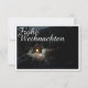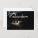 Die Karte zeigt eine stimmungsvolle, winterliche Szenerie mit einer kleinen, beleuchteten Holzhütte inmitten eines verschneiten Waldes. Die warme Lichtquelle im Inneren schafft einen schönen Kontrast zur dunklen, friedlichen Umgebung. Der elegante „Merry Christmas“-Schriftzug in Weiß verleiht dem Motiv eine festliche Note. 🎄✨