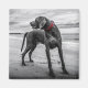 Photograph of a Weimaraner dog on a beach converted to black and white except for red collar.
