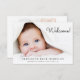 Cute and simple photo birth announcement. Your newborn's photo fills the front and is overlayed with "Welcome!" in a contemporary script (you can move this text to another area on the card to suit your photo by selecting "edit in the design tool"). Add his or her name, arrival date and birth stats. On the reverse side, add four additional family photos, a "welcomed by" message and the parent's and sibling's names.