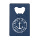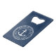 Bottle opener featuring a white, elegant anchor and rope emblem with customisable text "welcome aboard" and your boat name on a dark blue background.