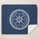 Sherpa blanket featuring a white, elegant ship's wheel and rope emblem with custom text "welcome aboard" and boat name on a dark blue background.