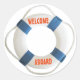Welcome Aboard Life Ring Stickers. White marine nautical lifering preserver with fully customisable orange texts "Welcome" and "Aboard" round stickers on a sheet. These cool marine stickers are fully customisable, add your texts and images!