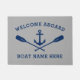 A beautifully inviting nautical theme doormat with welcome aboard and your personalised boat name, family name or other desired text. Features a custom designed boat anchor and crossed oars in navy blue on sea grey or easily customise the base colour to match your current decor. Makes a great gift.