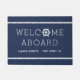 Welcome guests aboard your boat with this cool custom doormat featuring "welcome aboard" in white lettering with a ship's wheel in place of the "O." Personalise with your boat name and ship's registry beneath, on a classic navy blue background accented with white rope trim.