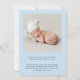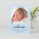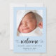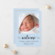 A simple and cute pastel blue baby boy birth announcement. The front features his photo, name, arrival date and birth stats, and "welcome" written in a stylish script with a heart swashes. On the reverse side of the card, add an additional photo, parent and sibling names, and a thank you or other message.