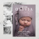 This beautiful, modern "welcome" birth announcement features a full portrait photo with bold text for customizing the name and birth details for your sweet new baby. Back side features a 4 photo black and white photo collage so you can fit in even more adorableness into your card! Share your happy news with this stylish introduction for family and friends. All elements of this card are fully customizable.