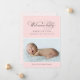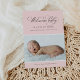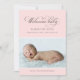 Announce your baby girl's arrival with this elegant "Welcome Baby" photo birth announcement card. Flowing calligraphy script in warm grey sits above a pink band displaying your newborn's name, birth date, weight, and length. Your favourite photo is showcased below with a message from the proud parents. The back features a coordinating pale pink damask pattern. All text and background colours are fully customisable.