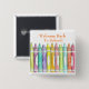 A cute button pin decorated with colour crayons drawn in pencil and coloured pencil in a rainbow of colours. A great pin for a teacher to welcome the kids back to school!