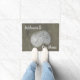 This house guest welcome mat features a nature photo that captures a sand dollar sitting in wet sand. The white sand dollar is surrounded by brown and grey sand. "Welcome To Our Home" appears in light grey and can be quickly customised if you desire.
