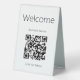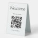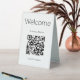 Welcome visitors to your business with this black and white tabletop sign. Welcome is above text that you can change to your business name. Also, you can enter your website URL to create a custom QR code. Additional text is near the bottom that you can edit to create a custom message. (Shown: Scan for Menu)