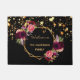 A chic black background with dripping faux golden stars. Decorated with a faux gold geometric frame and burgundy, pink and rose gold coloured flowers, florals. With the text: Welcome. Personalise and add your family name. Golden coloured letters.