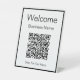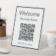 Welcome your visitors with this black and white tabletop sign. There's a display image that you can replace with your own QR code to send your customers to your menu or a price list. The display text can be edited to show your desired text. Display text reads: Welcome Business Name Scan for Our Menu.