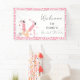 This charming welcome banner for the Boots & Bubbly Bridal Shower features a playful design with a woman’s legs kicking up her cowboy boots, surrounded by retro stars. A pink cowboy hat adds a fun touch, while a vase of flowers and pink Champagne with glasses set the perfect celebratory tone. The background is a whimsical pink cow print.