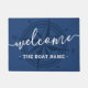 Dark blue or custom colour welcome aboard door mat featuring the text "welcome" and your custom boat name on a blue background with a compass rose in a darker shade of blue