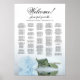 This gorgeous wedding seating chart features a photo of a long-stemmed pale dusty blue or powder blue coloured rose lying on its side reflecting in a pool of water with waves and ripples. The main title reads "Welcome!" with subtitle reading "please find your table" in elegant lacy script calligraphy. There is space for the up to 200 names with the names of the couple and wedding date below. Wonderful way to help your guests find their tables while making your reception more beautiful.