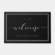 Welcome your guests to your home with your own custom personalized "Welcome" doormat. The design features a minimal and elegant design with "Welcome" displayed in elegant modern calligraphy. The letters extend to a simple double frame border design. Personalize with the family name and house number.