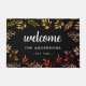 Welcome Fall Foliage Family Name doormat features a black background with white script type and colourful fall leaves. Personalise it with your family name and the established date.