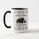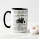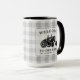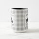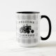 A beautiful, rustic themed large, 2 tone coffee mug, featuring artwork of a vintage farm tractor silhouette with text reading "Welcome to our farm" and your family name, established date or other desired text. This unique design rests on top of a grey and white country plaid print. To see more designs like this, feel free to visit my store here at "Zazzle.com/Rustic_Charm". Thanks.