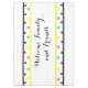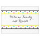 Welcome family and friends is written in pretty black script. Colourful geometric patterned cloth table cloth with pink, yellow, turquoise blue, black polka dots inside black sunny yellow striped borders. Background is white. Bright, fresh trendy circular shapes for the spring and summer months to brighten up the kitchen decor. Original artwork design © TamiraZDesigns. www.zazzle.com/tamirazdesigns