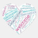 Heart shaped welcome design, saying WELCOME in over 60 different languages. The image is available for a variety of products. Text adding is optional.