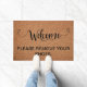 Customisable remove your shoes welcome doormat with a cork texture.