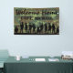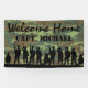 Military welcome home banner featuring a camouflage background, silhouettes of a marines, the text "WELCOME HOME", and the soldiers name.