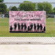 Custom girly military welcome home banner featuring a pink camouflage background, pink glitter, silhouettes of a soldiers, the text "welcome home" in a calligraphy script, and the soldiers name.