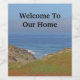 Welcome guests to your home with a wine bottle label featuring a landscape photo that captures the rolling hills and sand dunes with the crashing waves and blue horizon in the distance. The close dunes are covered with green coastal plants. The ocean displays beautiful shades of blue. "Welcome To Our Home" can easily be customised to suit your desires.