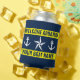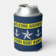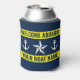 Welcome on board custom boat name nautical yellow Can Cooler. Custom beverage holder with maritime theme template design. Elegant accessories for beach home, yacht, lake house, cruise cabin, bedroom, sailing boat, beach party etc. Personalised Birthday gift ideas for friends, family, sailor, skipper, fisher, boat captain, dad, husband, grandpa, father, mum and others. Customisable colours. Also great for wedding party. Navy blue and white stripes with anchor symbols and star icons. Double sided print.