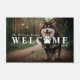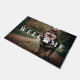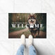 Photo welcome door mat for a family with dogs or cats. Welcome in large white letters as an overlay on a photo of your pet. A paw print instead of the O in Welcome. Add your family name and year established.